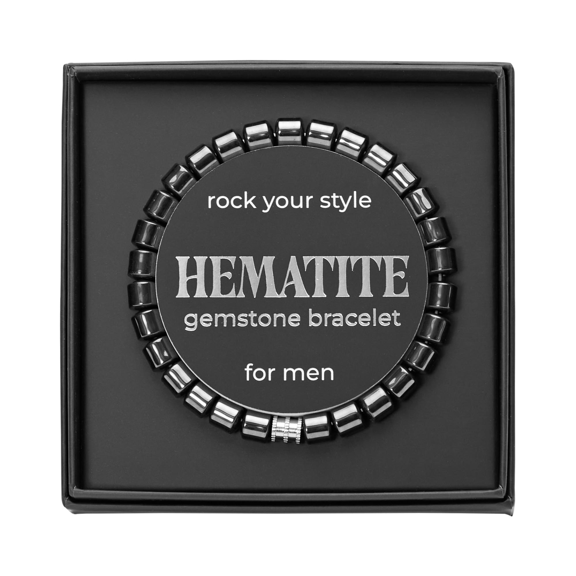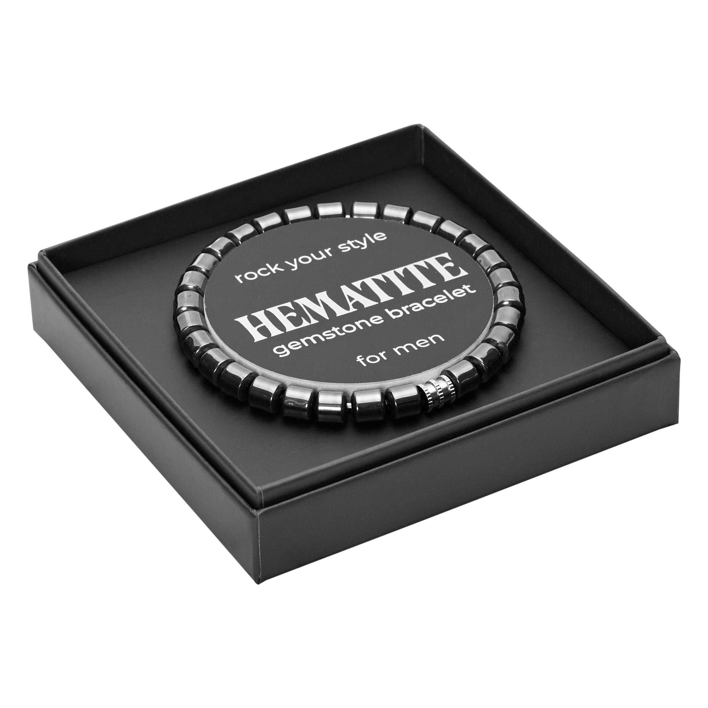 Dieses Armband aus Hämatit überzeugt mit seinen breiten, zylinderförmigen Perlen, die dem Schmuckstück eine markante und zugleich elegante Optik verleihen. Das dunkel-metallic glänzende Gestein sorgt für einen edlen Look, der sofort ins Auge fällt und sich vielseitig kombinieren lässt.