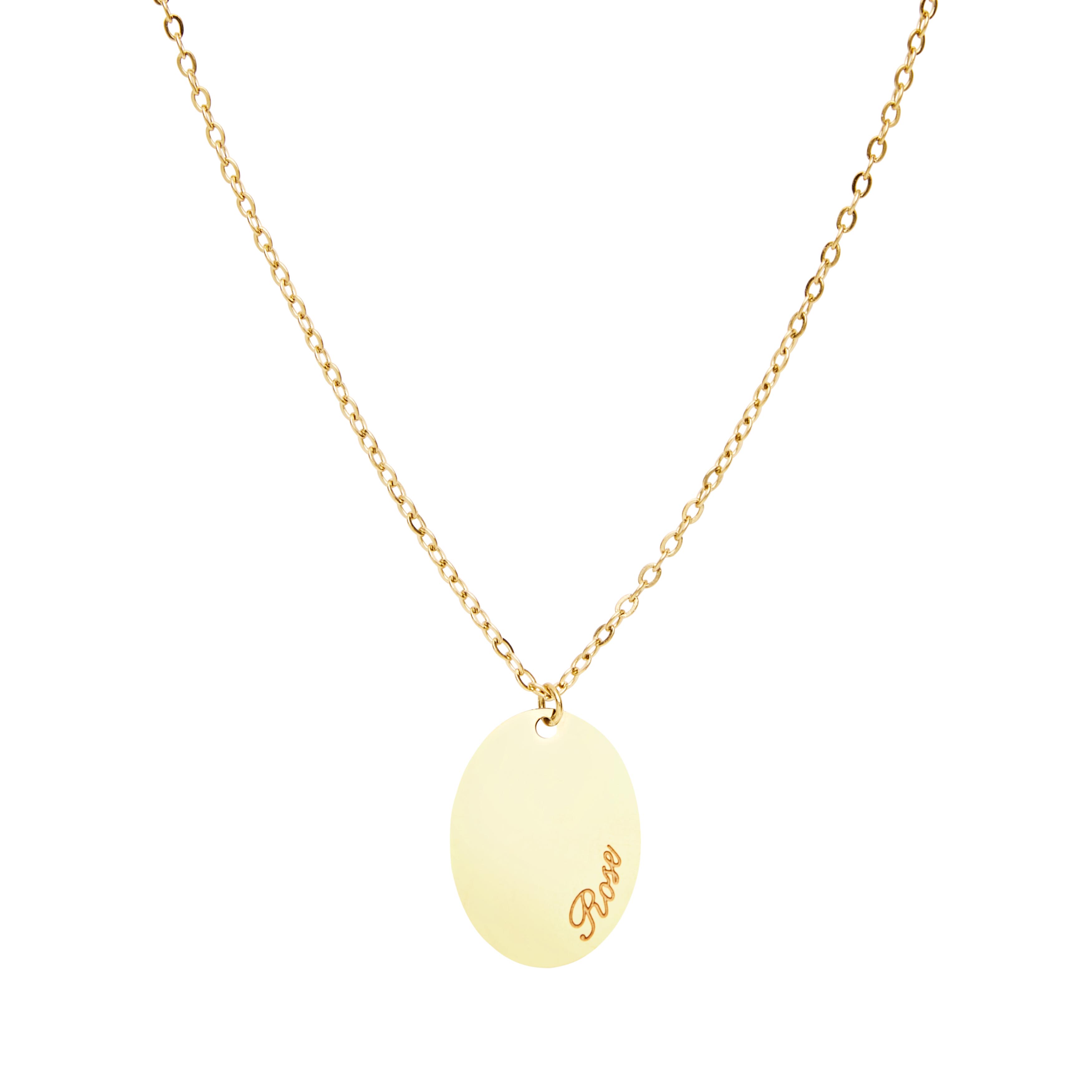 Anhänger: ovaler Anhänger mit Blumengravur auf der Vorderseite, auf der Rückseite ist der Name der Blume auf Englisch eingraviert